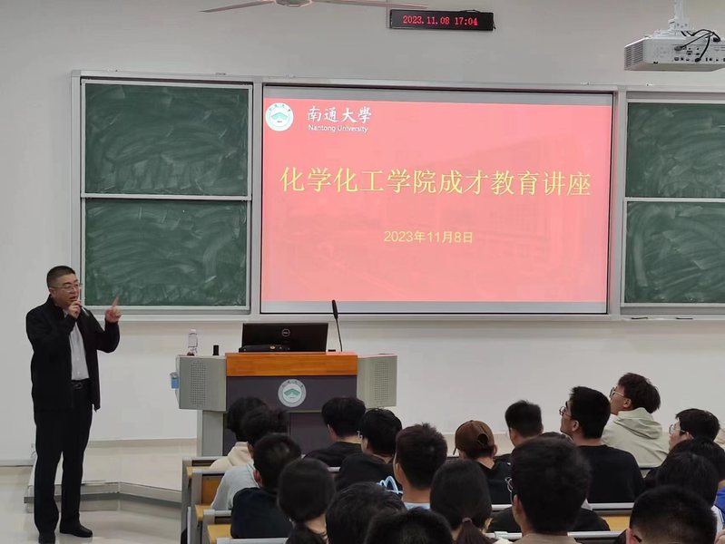 樊文新以《走近化工,走进化工》为题,分别从“我眼中的化工”、“我眼中的企业”、“我眼中的人才”三个方面,结合国家战略性新兴产业发展,深刻剖析了化工行业的重要地位以及未来发展趋势,他以江山股份公司为例,介绍了现代化工企业在环保和节能、安全和智能化生产的现状,消除人们对化工企业的误解和偏见,改变同学们对化工行业“危险、污染、工作环境差”等错误的认知。他鼓励同学们增强专业自信,针对化工行业人才需求旺盛的良好形势,要珍惜大学时光,勤奋学习,围绕企业对人才要求,要树立正确的价值观,要具备较强的专业能力,在思维、习惯、行为、学习等方面力求精进,加强修为,力争成为优秀人才,毕业后成为化工行业的骨干和精英。樊书记的报告内容详实,信息量大,既有理论高度,也有实践案例,极大的增强了同学们对专业的兴趣,给同学们的老员工活中指明了方向和目标,他的报告不时博得同学们的阵阵掌声。