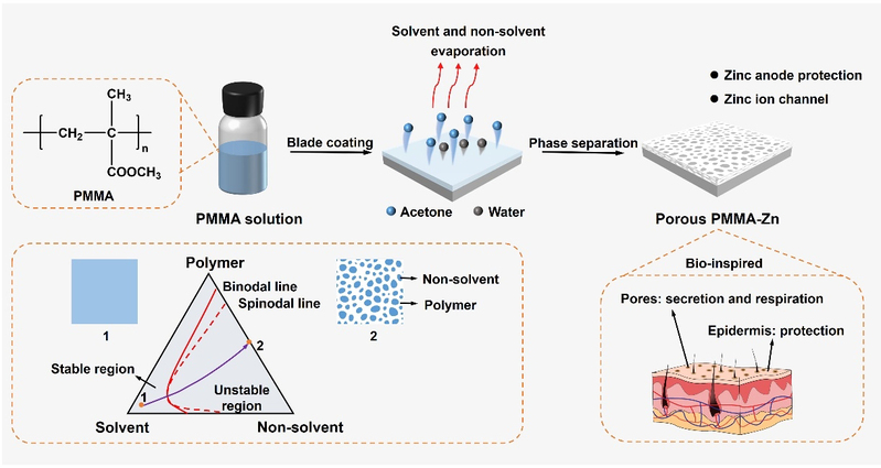 水系锌金属电池(AZMBs)因为具有高安全性、低成本、高理论比容量(820 mAh g−1或5855 mAh cm−3)和低氧化还原电位(-0.76 V vs. SHE)等优点,被认为是一种非常有前景的储能体系。然而,锌金属阳极存在枝晶生长、析氢反应、腐蚀等问题,这些问题导致锌阳极的可逆性和稳定性难以令人满意,从而限制了水系锌金属电池的应用。陆洪彬教授团队受天然皮肤多孔保护层的启发,采用简单低成本的相转化法在锌阳极构建了一层多孔聚甲基丙烯酸甲酯(PMMA)保护层。借助具有电绝缘性能和高度亲锌性的PMMA抑制副反应并促进均匀沉积,同时利用多孔结构提供扩散通道并增强反应动力学。得益于多孔PMMA涂层的保护和对离子迁移的调节,由改性的Zn阳极组装的对称电池在的条件下展现了超过4000小时的超长循环寿命,并在高电流密度和高容量(20 mA cm−2和20 mAh cm–2)下表现出120小时的优异稳定性。该工作中的实用低成本的方法,拓宽了传统聚合物在锌阳极保护中的应用。