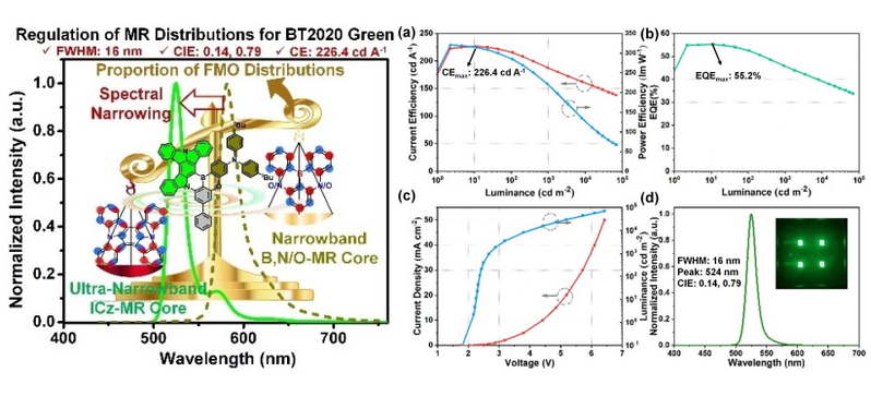 随着科技发展,人们对显示器提出更高要求,即需要更加真实地反映客观世界的颜色。因此,宽色域显示成为大势所趋,新一代的BT2020标准应运而生。对于OLED显示而言,则需要开发具有窄带发射特征的全色染料。相比于红色和蓝色,人眼对绿色区域最为敏感,超纯绿光需要严格满足“最大发射峰值在520-525 nm,以及半峰宽≤25 nm”的要求,而且光谱形状也要近似高斯分布。所以构筑超纯绿光染料非常困难。因此,发展高效率、高色纯度、长寿命的绿色OLED仍然是有机电子领域的“圣杯”,对于实现BT2020超宽色域、超高清显示至关重要。基于此,吴正光课题组与清华大学段炼课题组、三月科技公司合作,提出了精准调控硼氮多环芳烃多重共振分布区域的新策略,通过联合硼/氧多重共振(B/O-MR)片段和吲哚咔唑多重共振(ICz-MR)片段,构筑了新型绿色多重共振发光材料TPABO-DICz,其显示出超纯绿光发射,主峰位于515 nm处,极小的半峰宽为17 nm,CIE坐标为(0.14, 0.79),是目前半峰宽最窄和色度最优的绿光材料。以TPABO-DICz为客体材料制备的底发射OLED,其电致发光波长、半峰宽和CIE色坐标分别为522 nm、22 nm和(0.24,0.74),是目前最窄的绿光底发射器件。更重要的是,TPABO-DICz对应的顶发射OLED可以保持超宽色域,不仅表现出创纪录的0.79的CIEy值,而且还具有最大的电流效率226.38 cd A-1。同时,在10 mA cm-2 的恒定工作电流密度下,LT80的使用寿命也达到了 223.2小时。因此,上述设计策略将大大加速窄谱带超纯发光材料和宽色域OLED显示的发展及实际应用。