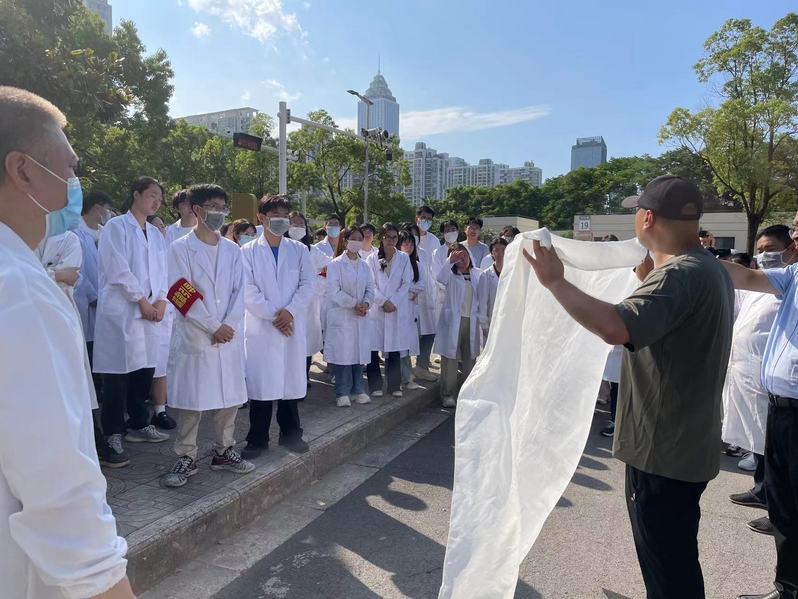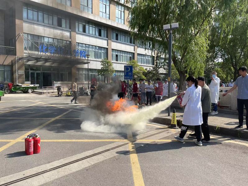 此次消防安全疏散演练分为消防安全知识讲座、安全疏散演练和消防灭火实操演练三个部分。第一阶段安全知识讲座,邀请南通市消防支队顾佳豪就消防安全知识对参加活动的师生进行了专题培训,重点讲解火情的判断、消防器材和设施的使用方法、高校常见的火灾隐患及整治措施等知识;第二阶段,开展消防安全疏散演练,总指挥李清湘主持演练活动,强调实验室安全工作是公司各项工作的重中之重,防范胜于救灾,本次应急演练活动是一次很好的契机,能够有效地提高师生的安全防范意识和应急处置能力,并对本次疏散应急演练活动进行了部署。消防安全疏散演练活动开始后,参加演练师生各组人员迅速各就各位开始演练流程,随着报警器的响起,全体师生迅速进入应急状态。在疏散员的引导下,演习人员用湿毛巾捂住口鼻,弯腰低姿,沿着指定的疏散路线快速有序地撤离到15号楼前。在疏散过程中,师生们始终保持冷静,有序从就近安全出口撤离,确保大家安全到达集合点。第三阶段开展消防灭火实操演练,保卫处于小冬科长讲解了实验室危险化学品初级火灾事故的处置方法,介绍了干粉灭火器使用方法和使用范围,并组织师生们进行现场油盆灭火实操练习和消防带接头使用方法,鼓励师生们积极动手操作,提升了师生们的灭火处置能力。